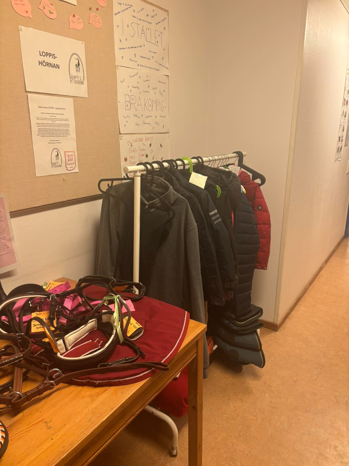 Loppishörnan hittar ni i anslutning till cafeterian vid trappen, där finns allt från schabrak och hjälmar till ridkläder och tillbehör. Perfekt för dig som vill uppdatera utrustningen eller ge dina saker ett nytt hem.